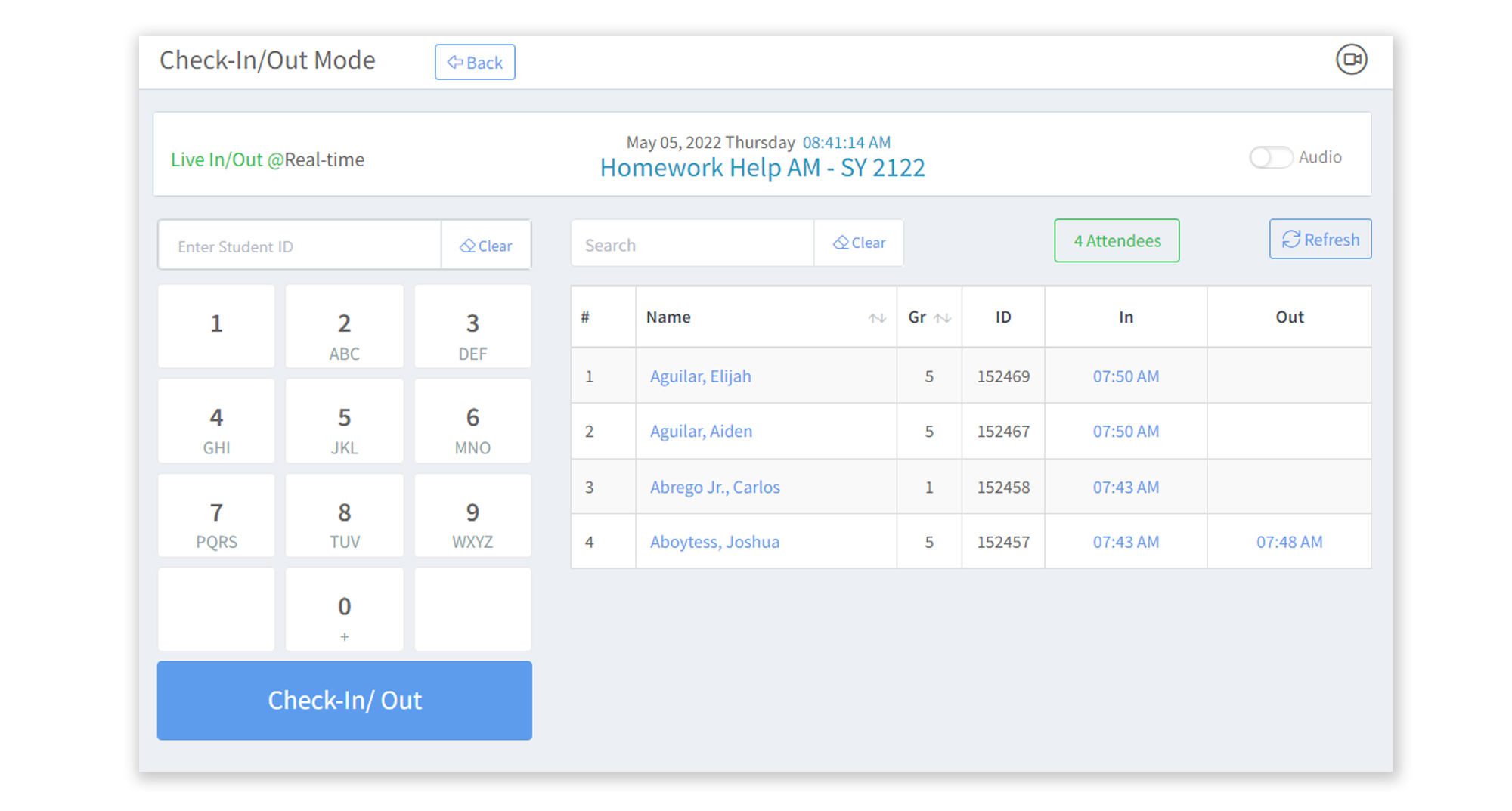 • Students can check in/check out themselves in real-time using student kiosks by scanning their ID badge or keying in their Student ID