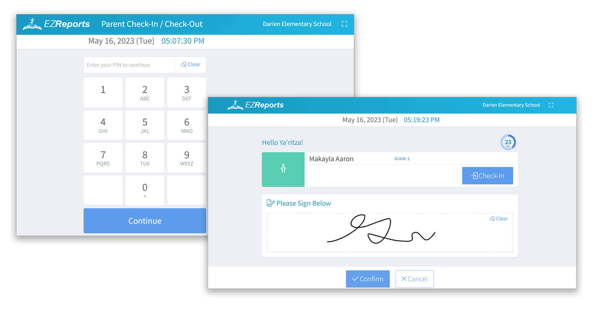 • The optional parent check-out feature can be used by parents to check out their children electronically